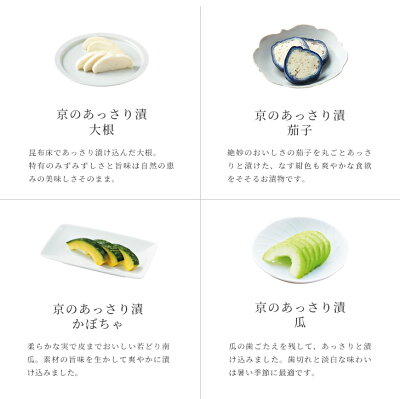 ※原料事情により8月18日お届け分より、京のあっさり漬かぼちゃ半割、京のあっさり漬瓜半割⇒京のあっさり漬夏キャベツ228g、しょうゆ漬大根150gに変更になります。