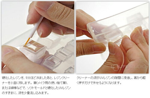 硬化前のレジン液のクリーナーとして大活躍! 硬化後、モールドとレジンのすきまに流し込むことによって型を傷めずに外すこともできます。