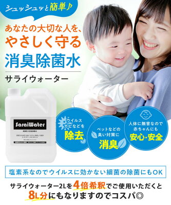 サライウォーター2L 次亜塩素酸水 除菌 消臭【7/14リアルタイムランキング1位】次亜塩素酸 無害 消臭除菌水 プール 塩素 臭い 犬 猫 ペット臭 家庭用 子ども たばこ 靴 うがい スプレー トイレ におい カビ 汗臭 消臭剤 除菌剤 即送 【遮光袋付】不定期で容器変更の可能性有