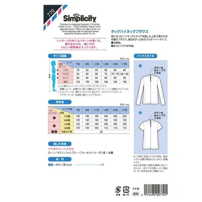 型紙 実物大 Simplicity レディ タックハイネックブラウス 770 サンパターン