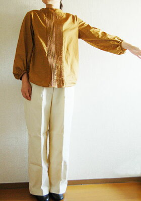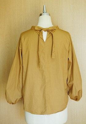 ◆表地 ●100/2コーマブロード(W巾)(布帛) ●カラー ・キャメル ◆フロントデザイン ◆サイドデザイン ◆バックデザイン ◆ピンタック前身頃 ◆オリジナルより細いリボン衿 ◆オリジナルAデザインのイレギュラー袖使用 ◆シャツテイル