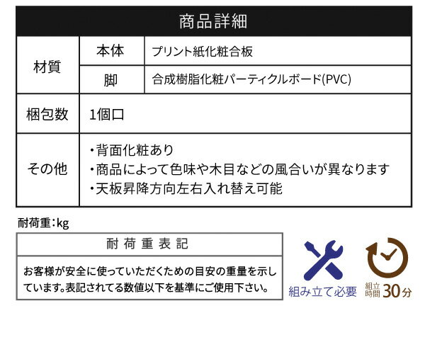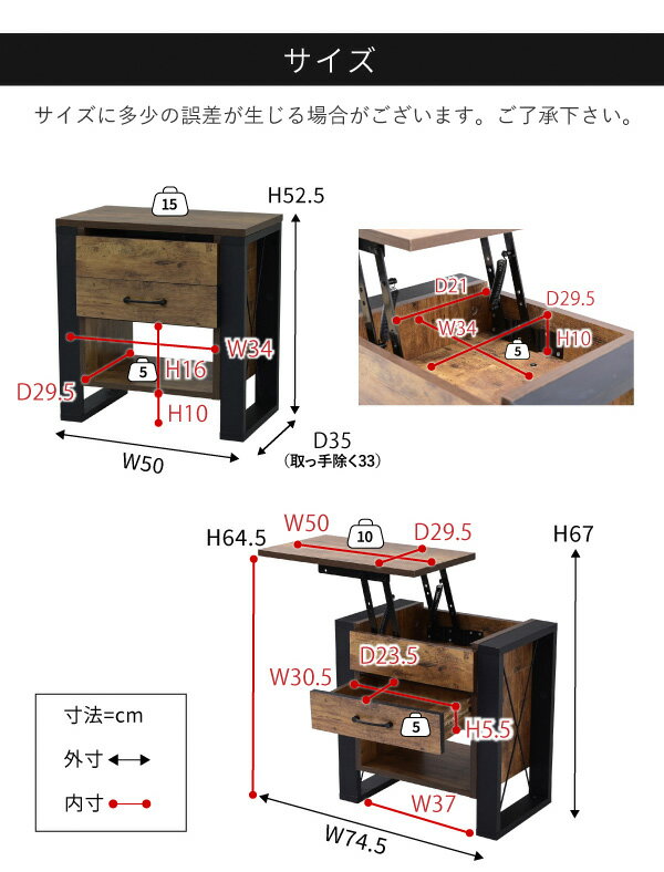 【本体サイズ】[外寸](リフト閉)幅50×奥行35(取っ手除く33)×高さ52.5cm(リフト開)幅74.5×奥行35(取っ手除く33)×高さ67cm【その他サイズ】[内寸](リフト部天板)幅50×奥行29.5cm(天板内収納部)幅34×奥行21(29.5)cm×高さ10cm(引き出し)幅30.5×奥行23.5×高さ5.5cm(オープン部)幅34×奥行29.5×高さ16cm(脚間)幅37.5×高さ10cm【材質】[本体]プリント紙化粧繊維板[脚]合成樹脂化粧パーティクルボード(PVC)【収納量・耐荷重】[天板](リフト閉)約15kg以下(リフト開)約10kg以下[天板下収納部]約5kg以下[引き出し]約5kg以下【備考】・背面化粧有り・天板リフトアップ方向左右入れ替え可能・商品によって色味や木目などの風合いが異なります。