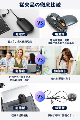 ワイヤレスマウス USB充電式 マウス 薄型 静音 軽量 光学式 高精度 2.4GHz 3段調節可能DPI 有線マウス 無線マウス 有線 無線両対応 Mac/Windows/PC/Laptop/Macbookなど多機種対応 在宅勤務 オフィス 出張 に最適 2021