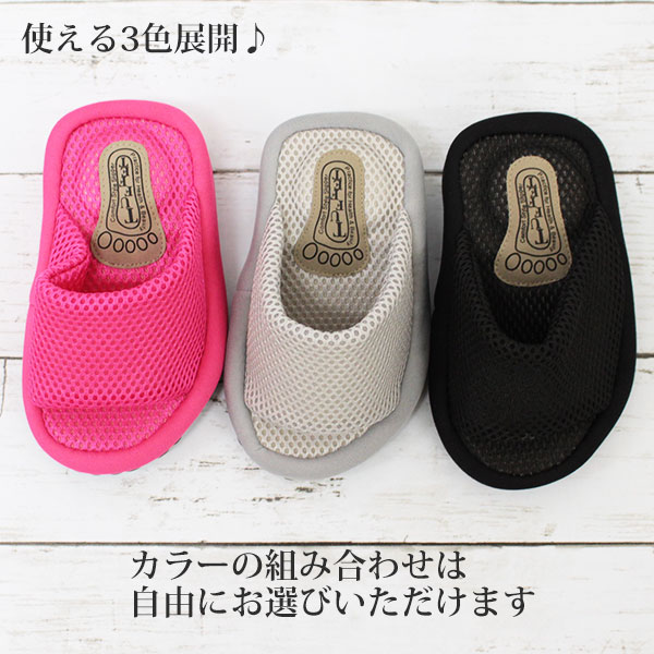 ------商品名------------------- ダイエット スリッパ Su Su COOL HEALTH [フリーサイズ] 3colors ------カラー-------------------- ピンク(桃色) グレー(灰色) ブラック(黒色) ------素材について--------------- アッパー:合成素材(メッシュ地) ソール:合成底 ------サイズ-------------------- こちらの商品は【女性用のフリーサイズ】です。